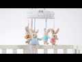 This beautiful Peter Rabbit musical cot mobile features four characters from the original tales of Beatrix Potter. Peter Rabbit, Flopsy Bunny, Benjamin Bunny and Cotton Tail hang from a circular fabric mobile with cute "Sleep tight little bunny" wording. This mobile has a traditional wind up music box and the four characters rotate gently as it plays a soothing lullaby. This mobile is easy to assemble and the plastic arm can be adjusted to fit securely between the bars of the cot. Plays Brahms Lullaby.